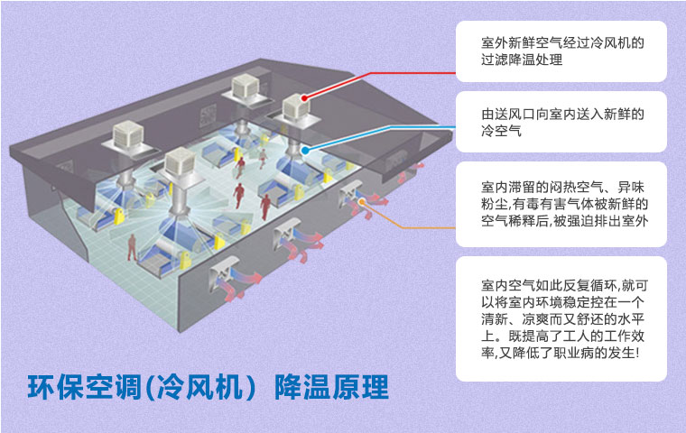 在空氣不流通的環境中,尤其是化工車間,容易産生建築綜合症,如悶熱、頭疼、眩暈、過敏、咳嗽等不适症狀。使用環保空調(冷風機)通風降溫方案即可以有效降溫,又能保證空氣流通